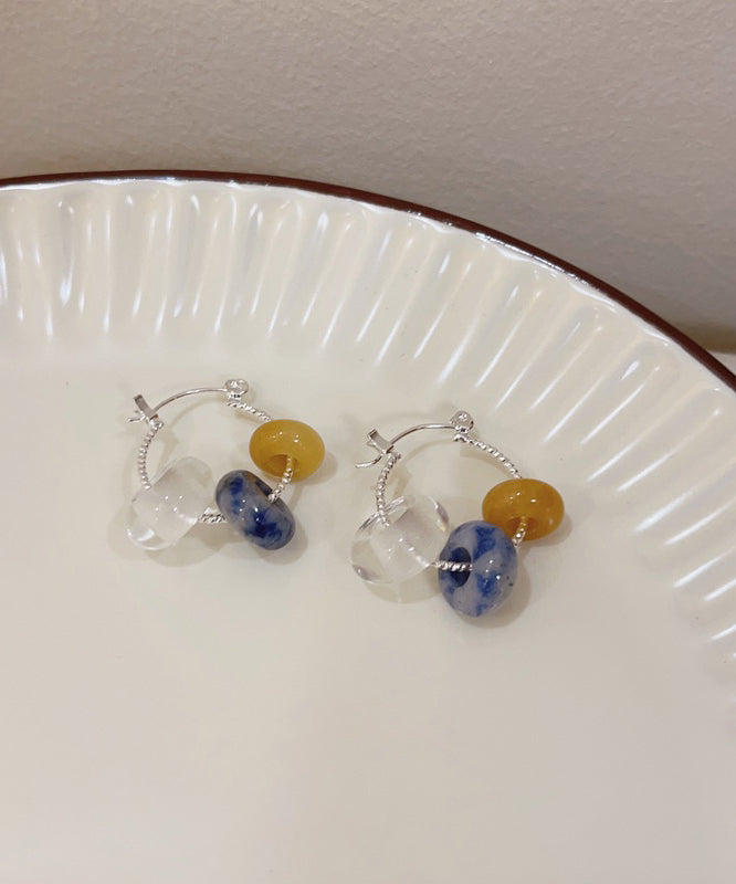 Handmade Colorblock Copper Alloy Gem Stone Beading Hoop Earrings QJ030