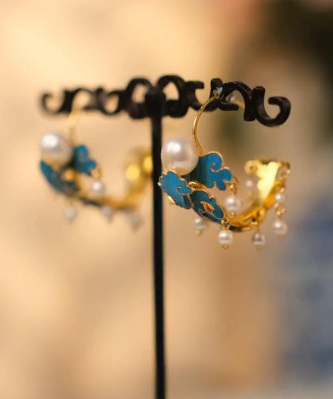 Hoop Cloisonne Sterling Silver Blue Tassel Pearl Enamel Vintage FashionChic