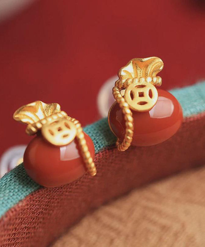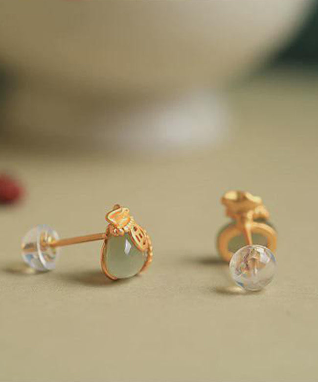 Retro Light Green Sterling Silver Overgild Jade Blessing Bag Stud Earrings TX035