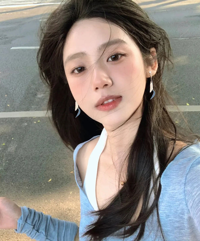 Skinny Blue Sterling Silver Alloy Feather Tassel Drop Earrings QQ016
