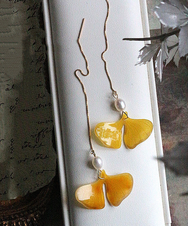 Stylish Yellow 14K Gold Pearl Ginkgo Leaf Tassel Drop Earrings GH1070