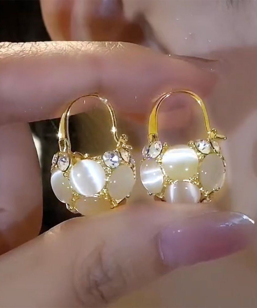 Women Gold Sterling Silver Overgild Cat Eye Stone Flower Basket Hoop Earrings WH025