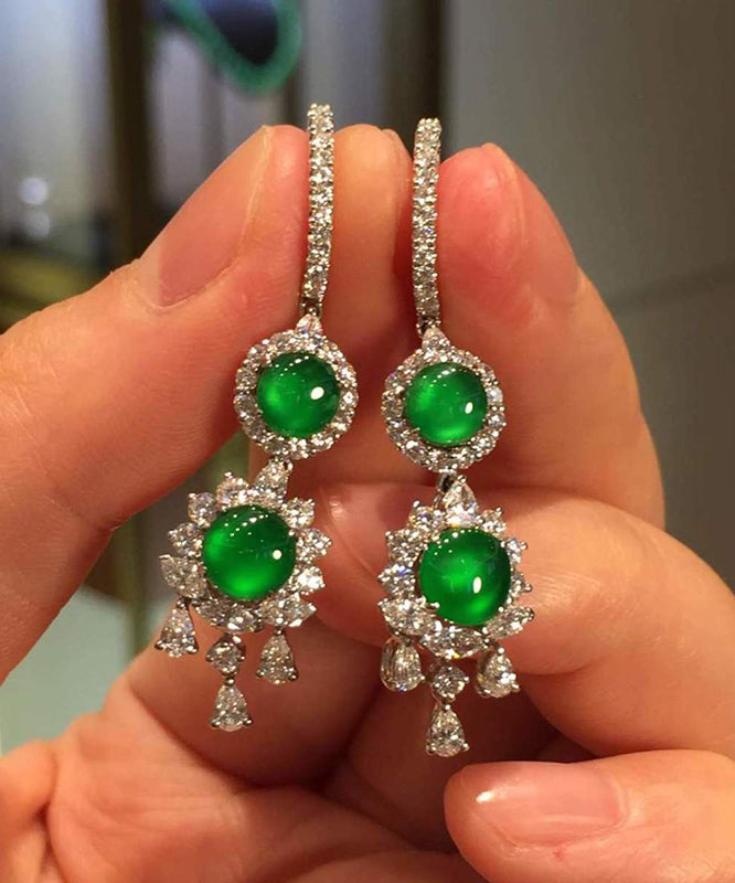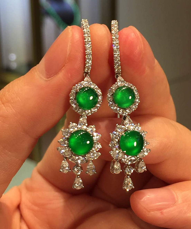 Women Sterling Silver Inlaid Zircon Jade Tassel Drop Earrings AC1037