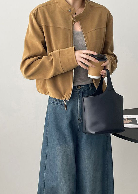 Fashion Brown Stand Collar Zippered Faux Suede Coats Fall WD006