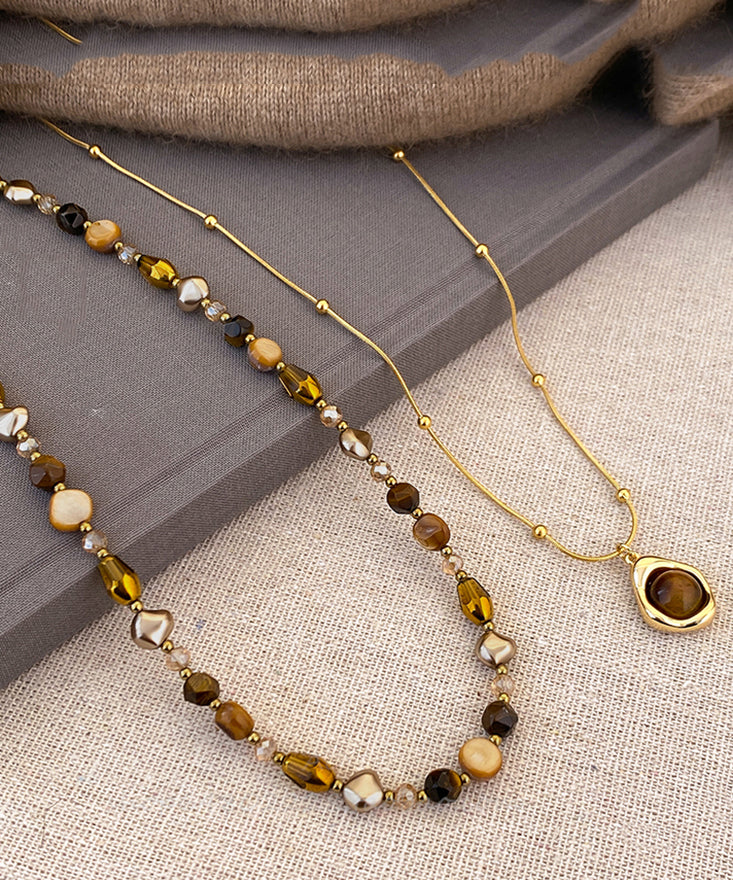 Fashion Gold Copper Overgild Tiger Eye Stone Beading Pendant Necklace Two Piece Set