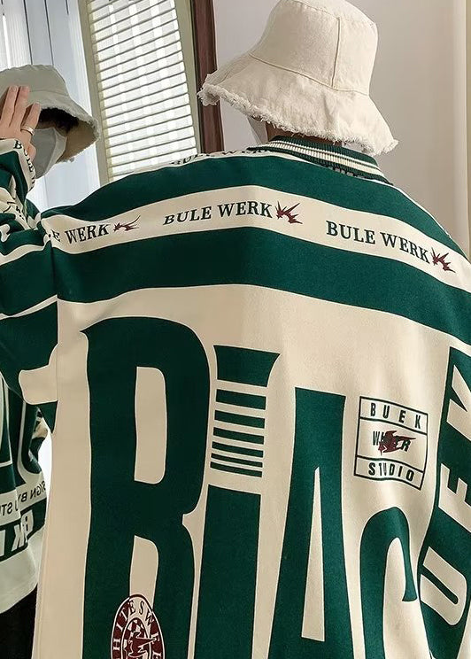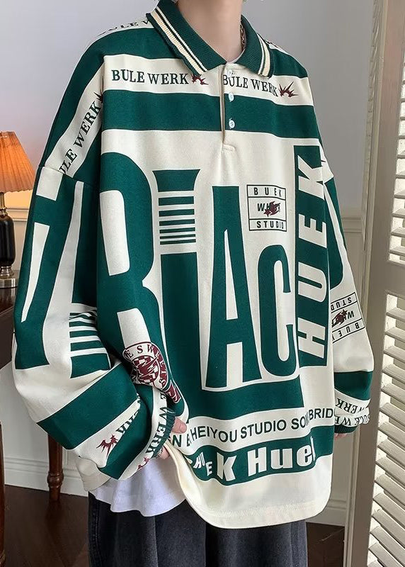 Fashion Green Peter Pan Collar Cotton Men Graphic Polo Shirts Fall WJ003