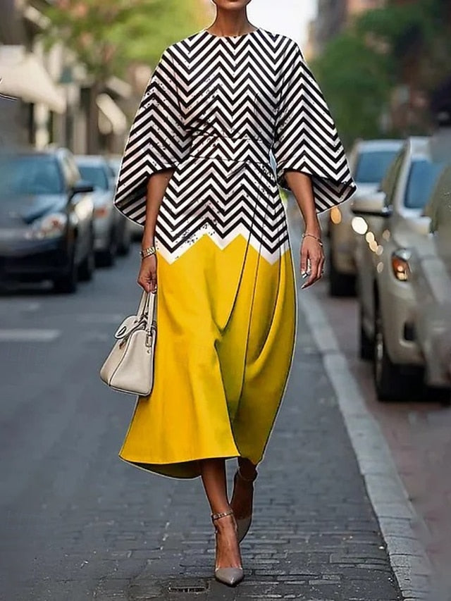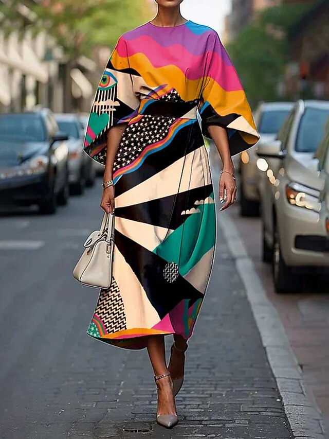 Dresses Type: Print Dress, Floral Dress, Fabric: Polyester, Gender: Women's, Design: Print, Occasion: Vacation, Holiday, Going out, Outdoor, Style: Fashion, Elegant, Fit Type: Regular Fit, Dress Length Type: Midi Dress, Neckline: Crew Neck, Sleeve Length: Half Sleeve, Elasticity: Micro-elastic, Look After Me: Machine wash, Pattern: Geometric, Flower, Season: Summer,