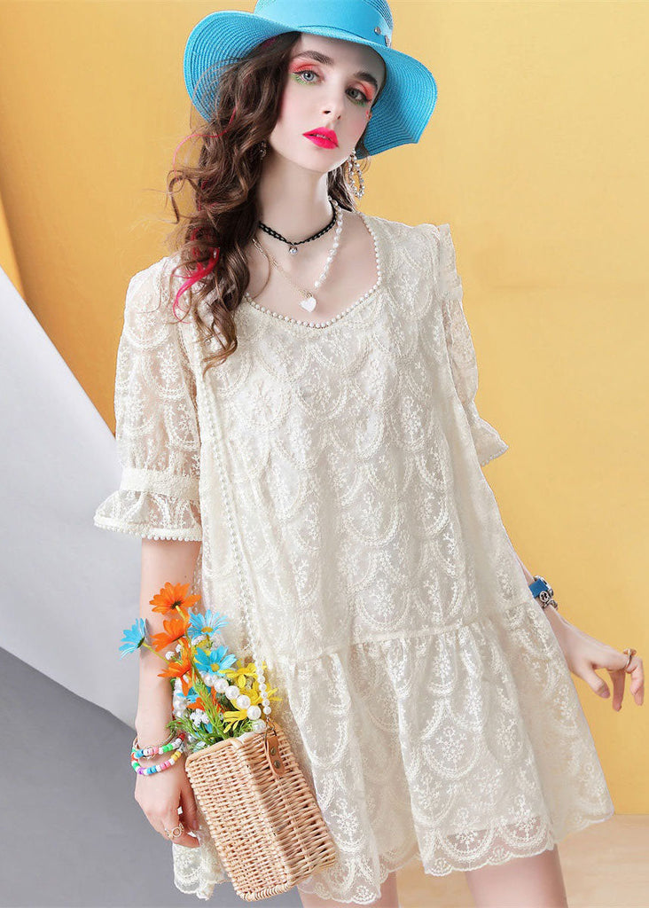 Life is too short to live without the Fitted Beige Square Collar Nail bead Patchwork Lace Mid Dress Petal Sleeve LC0250. Be happy. Be Content. Be Satisfied.