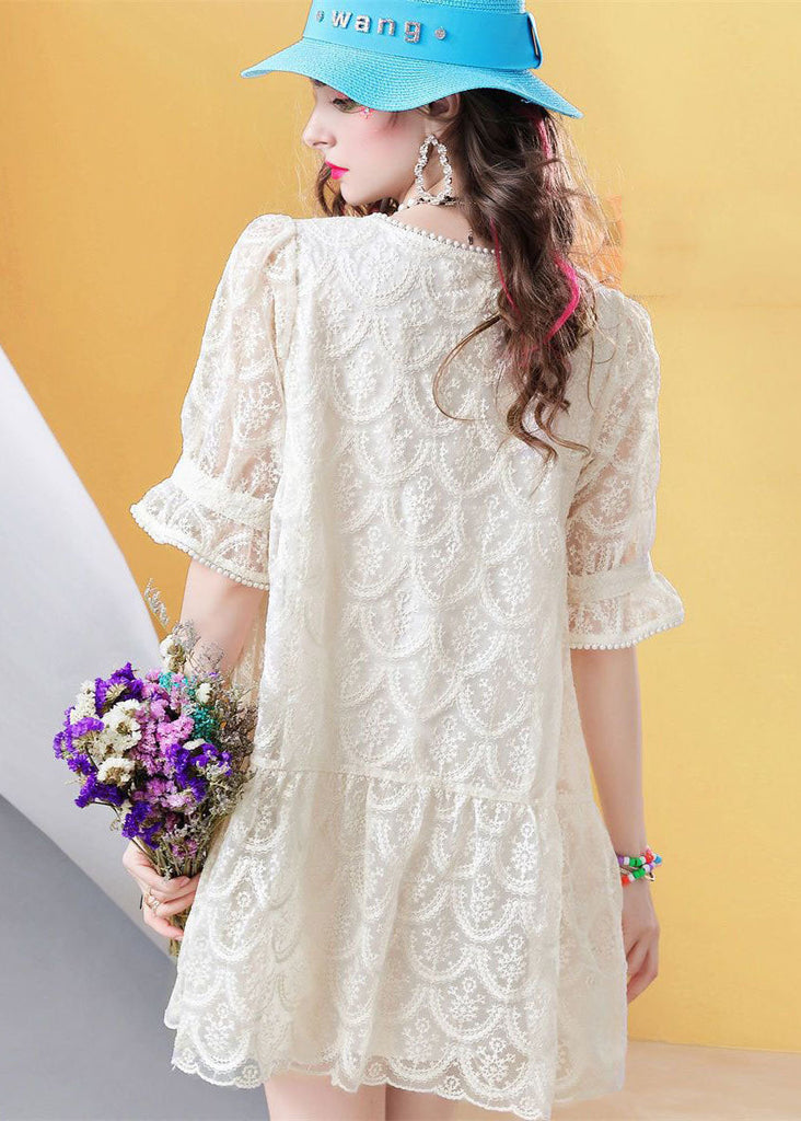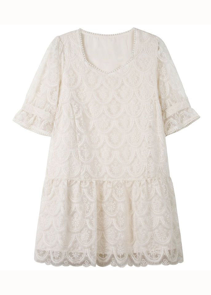 Fitted Beige Square Collar Nail bead Patchwork Lace Mid Dress Petal Sleeve LC0250