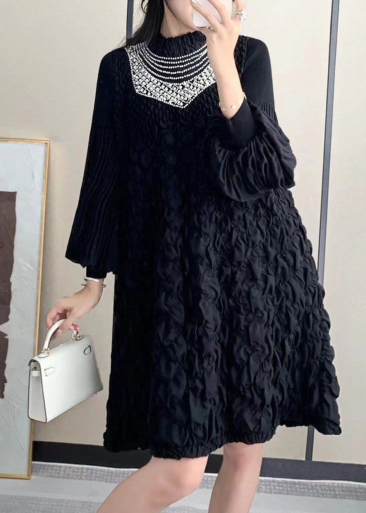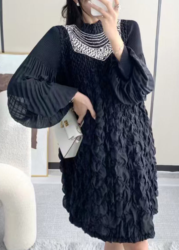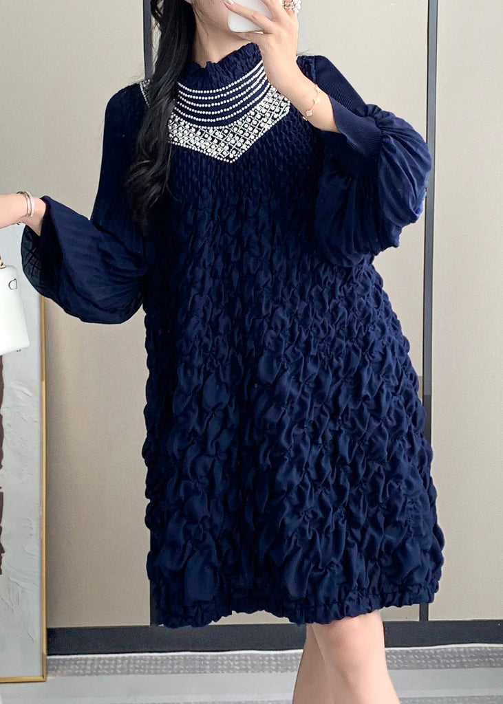 Experience the sophisticated elegance of our French Beige Stand Collar Wrinkled Nail Bead Mid Dress with Lantern Sleeves. Crafted with luxurious attention to detail, this dress exudes exclusivity and refinement.
