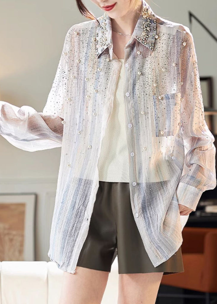 Indulge in luxurious fashion with our Handmade Blue Peter Pan Collar Nail Bead Shirt Fall. Crafted with exquisite detail and adorned with delicate nail beads, this shirt exudes elegance and sophistication. The iconic Peter Pan collar adds a touch of whimsy to your wardrobe, making it the perfect addition for fall.