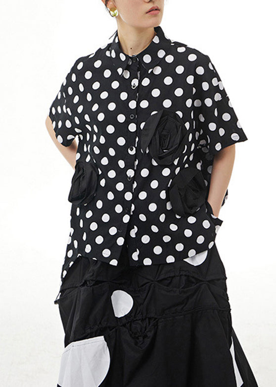 Chic Black Peter Pan Collar Dot Cotton Shirt Summer