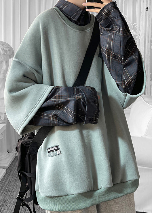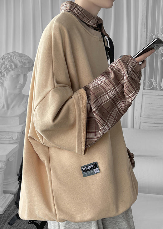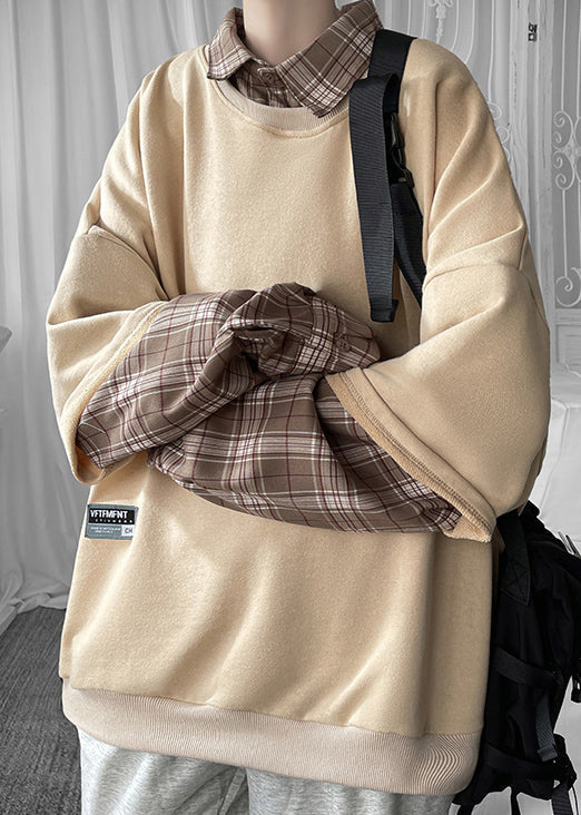 Cool Khaki Peter Pan Collar Plaid Patchwork Cotton Mens Sweatshirts Spring