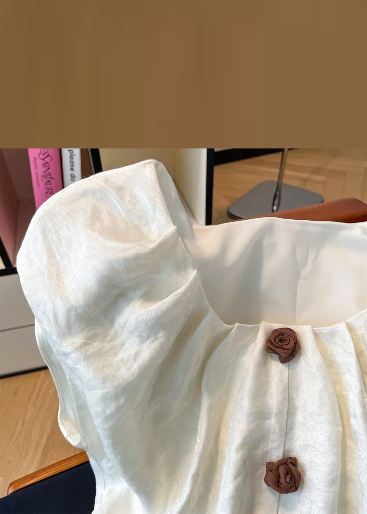 Floral Beige Square Collar Front Open Silk Shirt Summer