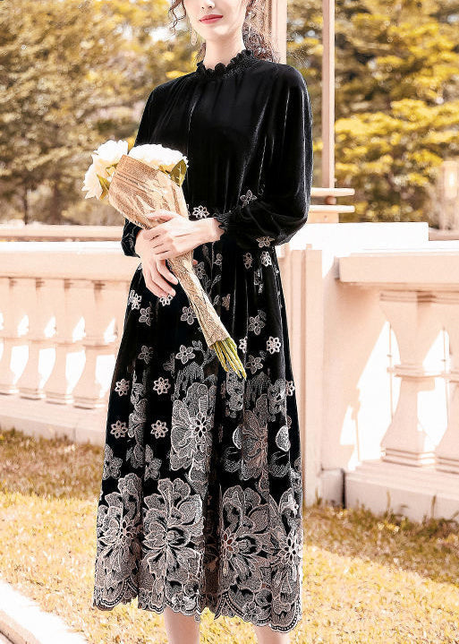 French Black Stand Collar Embroideried Silk Velour Cinched Dresses AC3051
