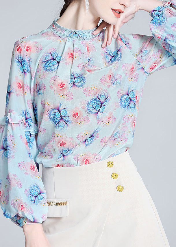 The Italian Blue Stand Collar Print Silk Tops Lantern Sleeve AC3030 is a sensational customer favorite, and we hope you like it just as much.