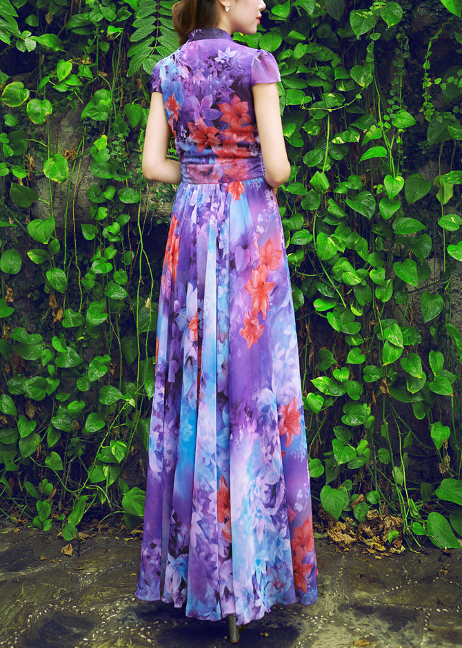 Italian Purple Stand Collar Print Chiffon Maxi Beach Dresses Summer
