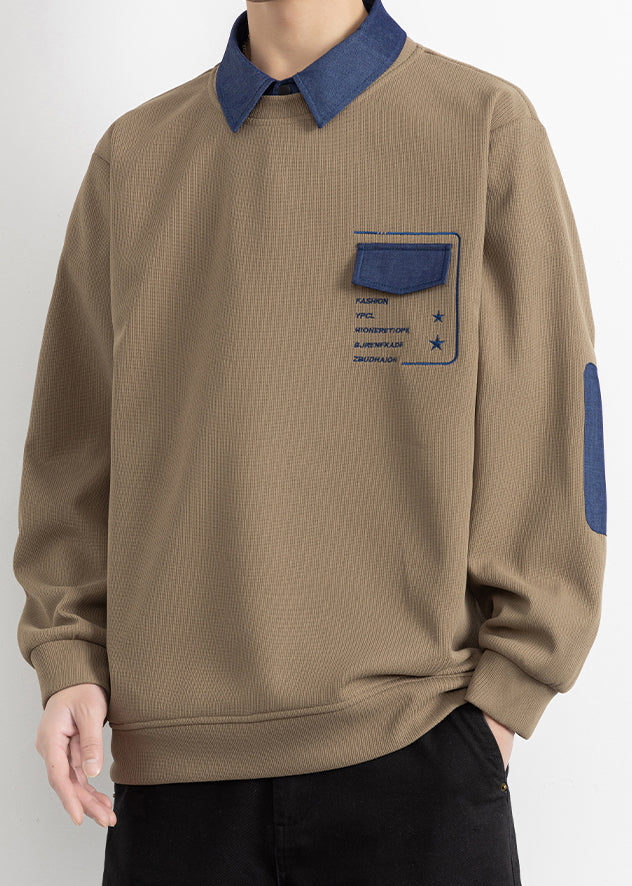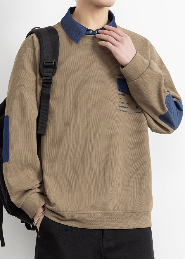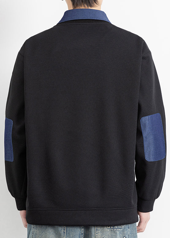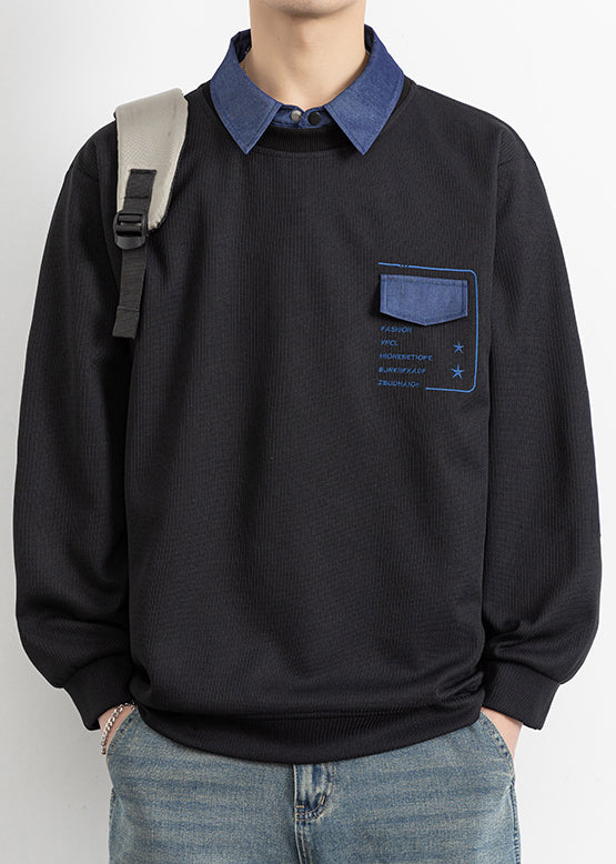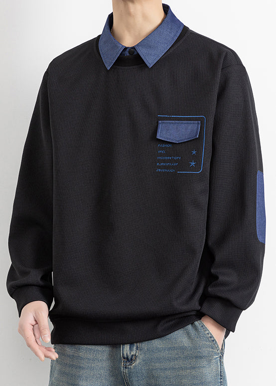 Stylish Black Peter Pan Collar Patchwork False Two Pieces Cotton Men Sweatshirt Spring