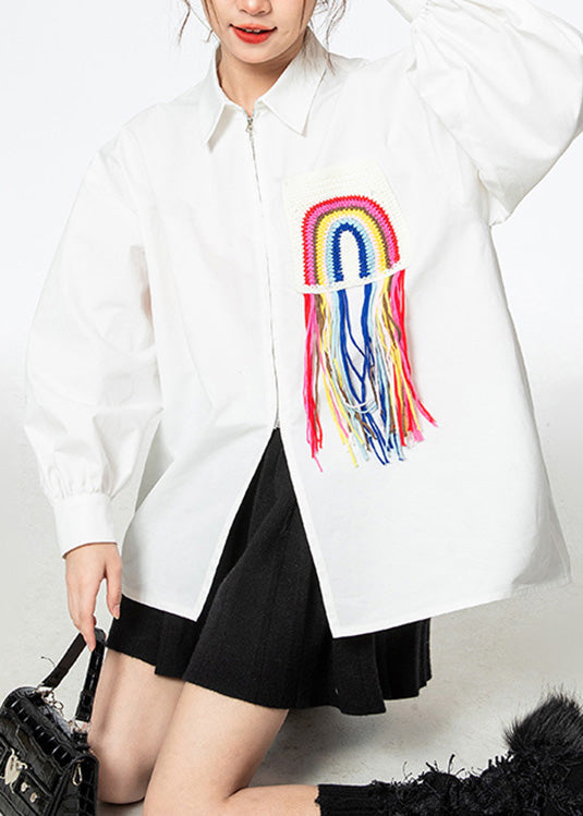 Simple White Peter Pan Collar Print Rainbow Zippered Button Cotton Shirt Puff Sleeve LY0797