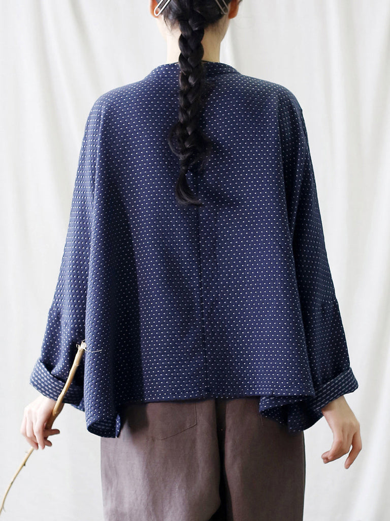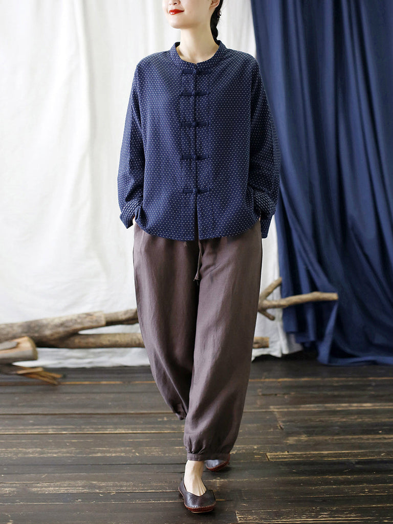 Women Autumn Vintage Dot Button Stand Collar Cotton Jacket AT1062