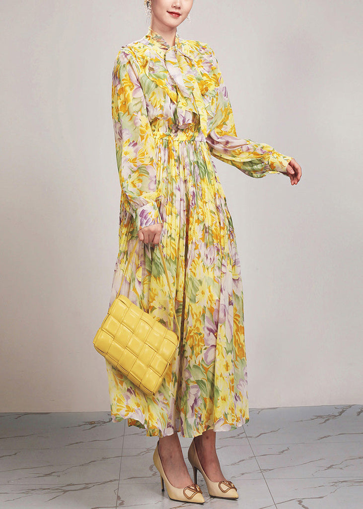 Beautiful Yellow Print Lace Up Chiffon Long Dress Long Sleeve AR1037