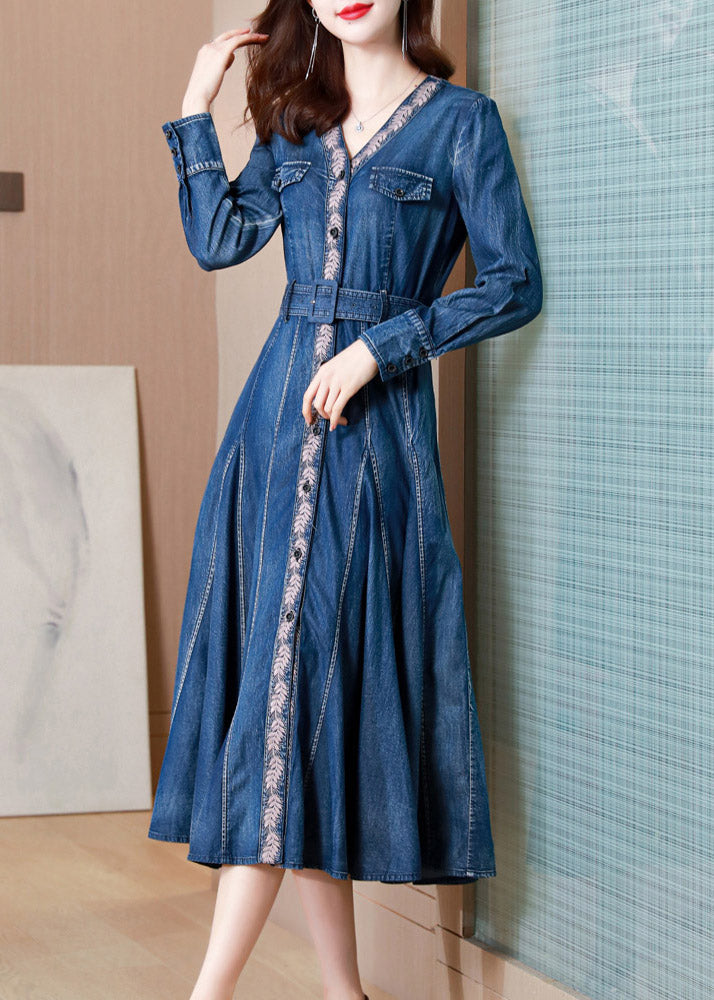 Casual Blue V Neck Print Button Sashes Silk Denim Maxi Dresses Long Sleeve AC2017