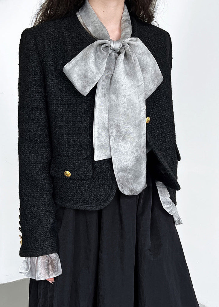 Elegant Black O-Neck Button Woolen Coat Long Sleeve QE061