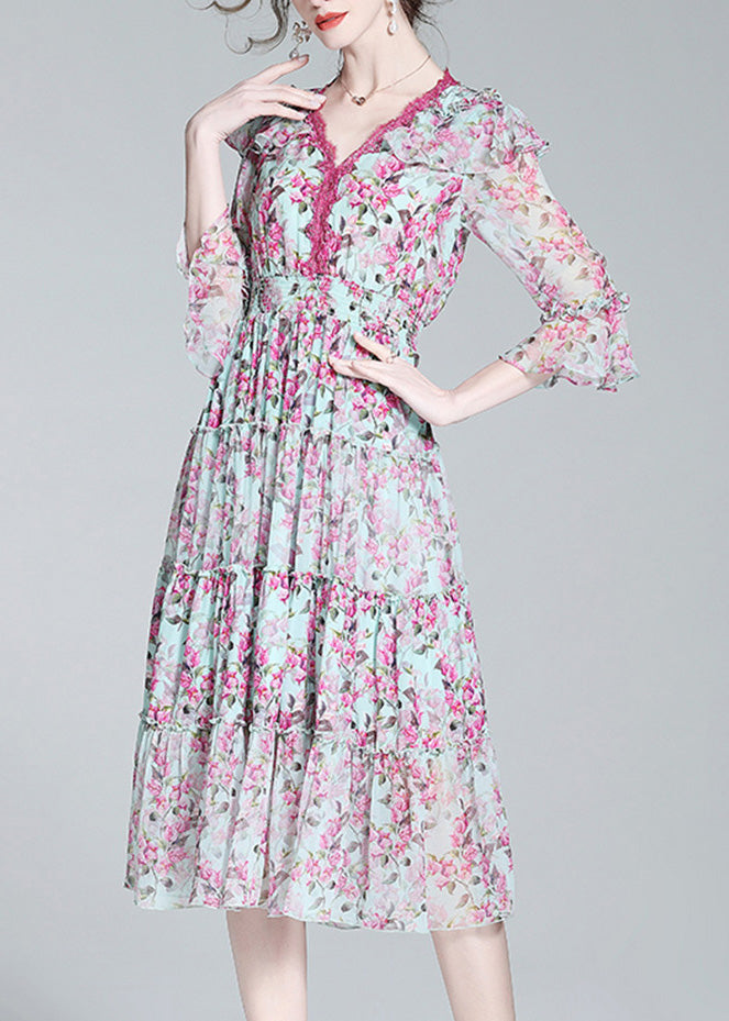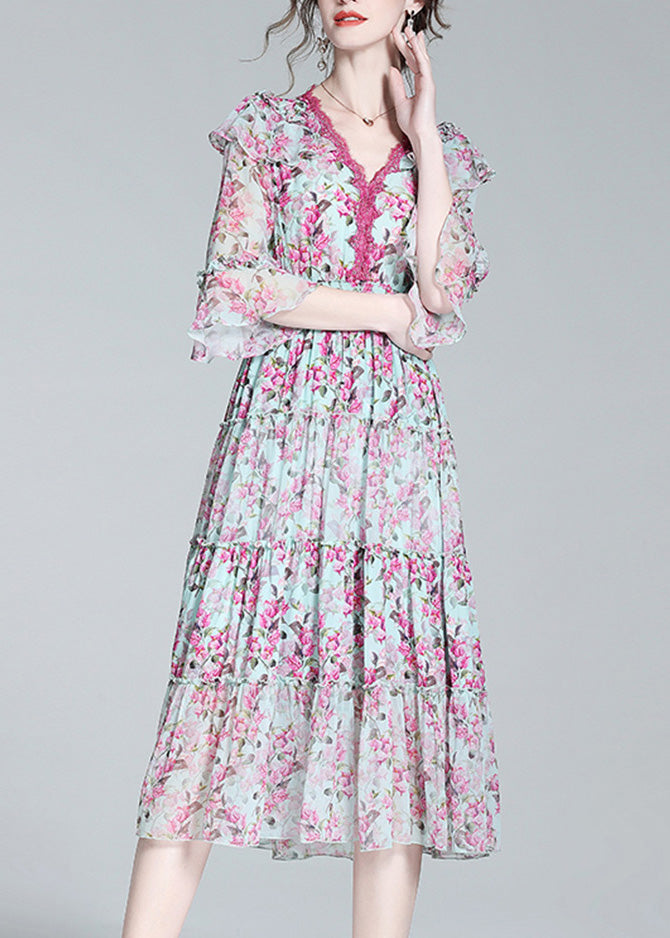 Elegant Purple V Neck Print Patchwork Tunic Silk Long Dress Long Sleeve