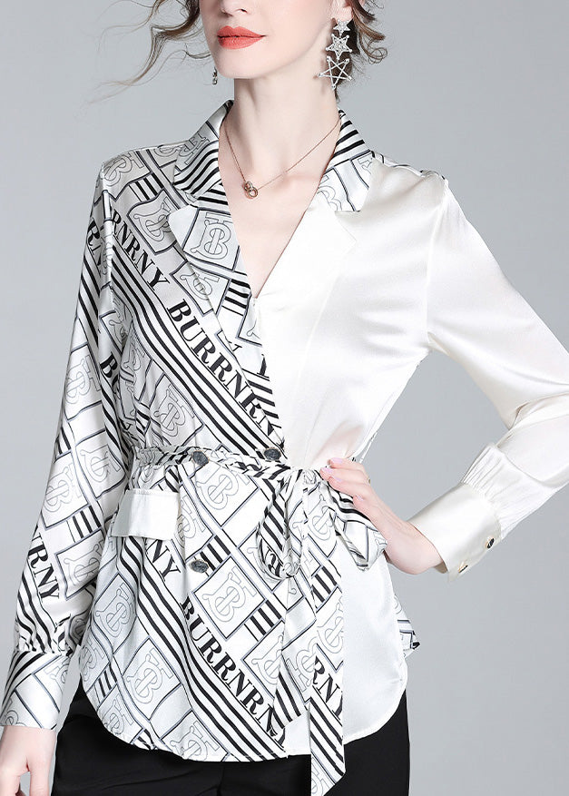 Elegant White V Neck Patchwork Print Tie Waist Silk Shirt Long Sleeve LY0090