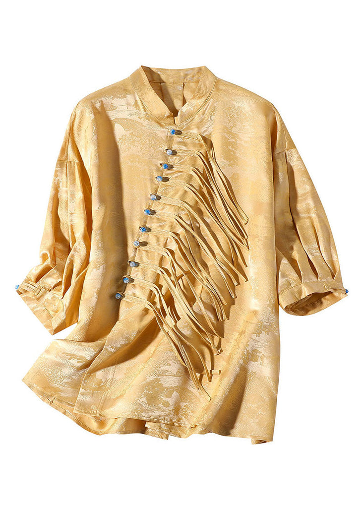 Jacquard Yellow Stand Collar Button Silk Shirt Long Sleeve LY0100