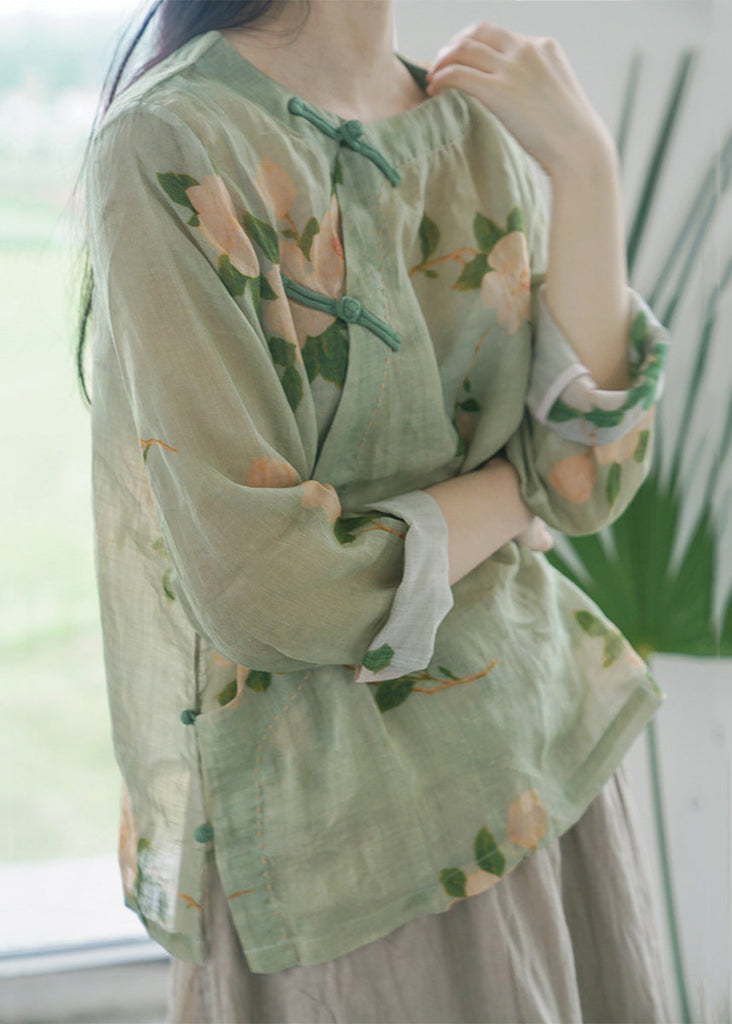 New Green Button Print Cotton Shirt Long Sleeve JH031