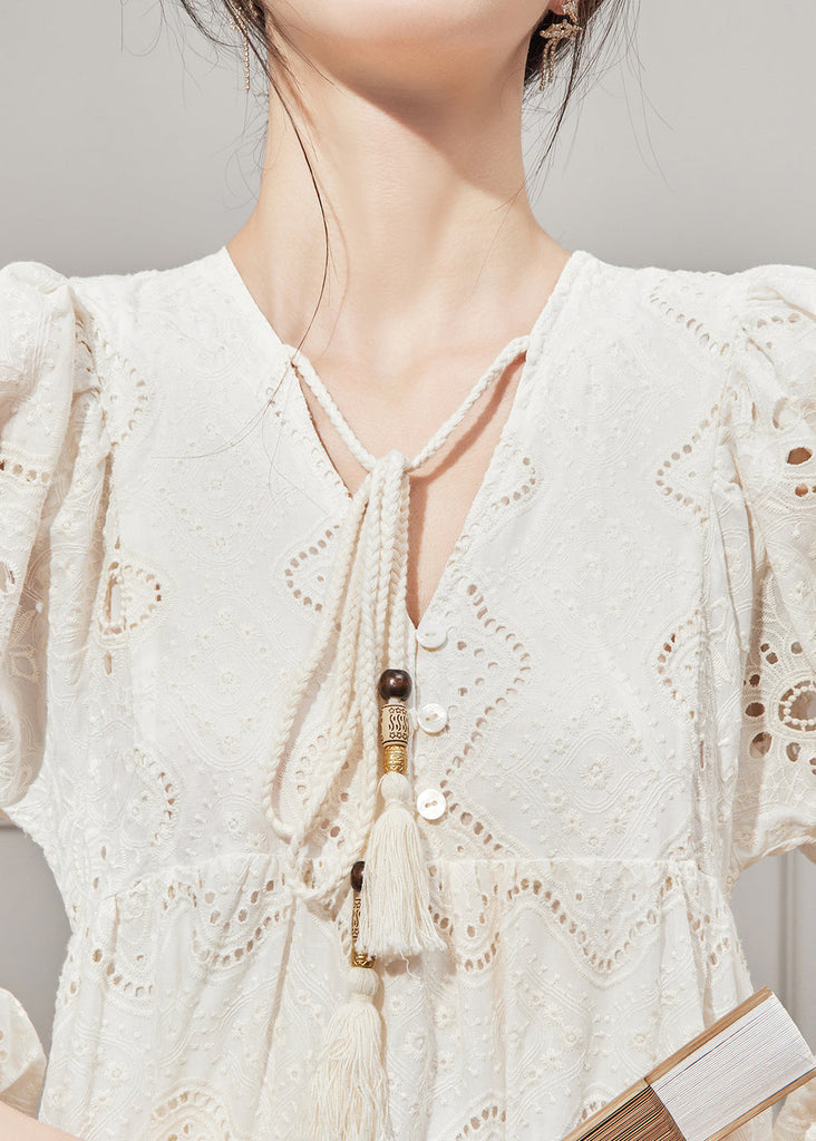 New White Lace Up Hollow Out Cotton Dress Long Sleeve AJ1040