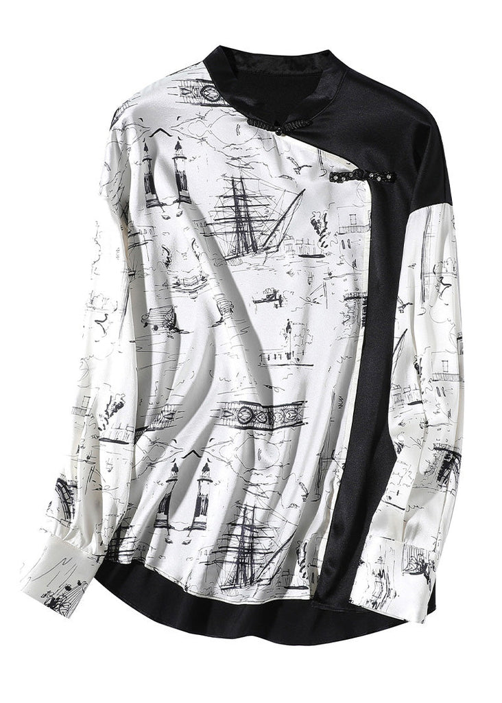 The Novelty White Patchwork Black Stand Collar Button Silk Shirts Long Sleeve LY0721 is a sensational customer favorite, and we hope you like it just as much.