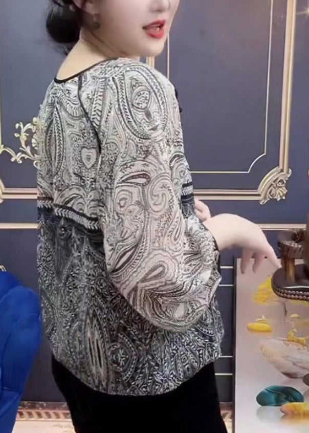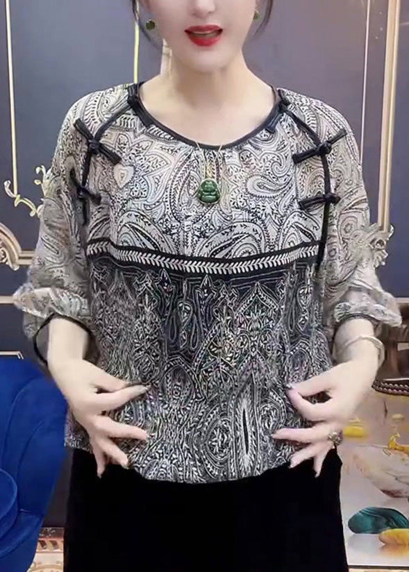Retro Print O-Neck Chiffon Top Long Sleeve