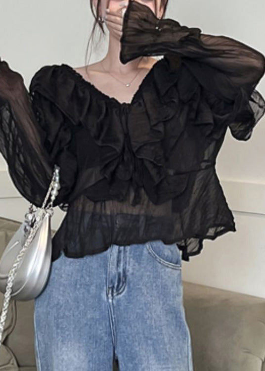 Sexy Black V Neck Ruffled Chiffon Shirts Long Sleeve