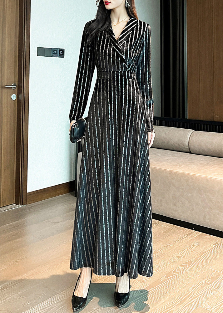 Slim Fit Black Notched Striped Maxi Dresses Long Sleeve LY1717