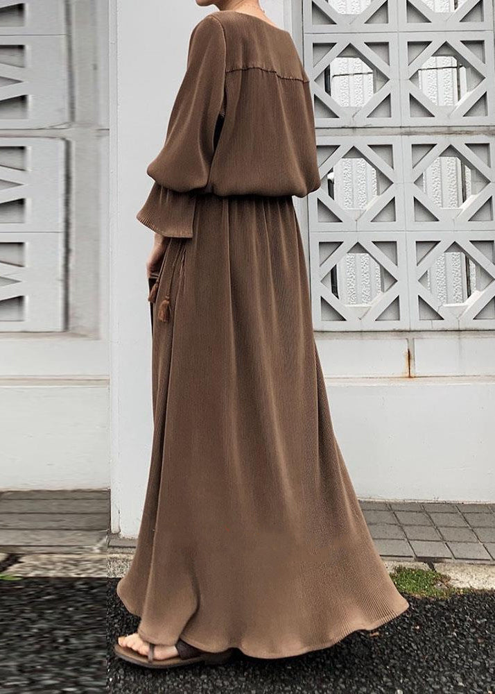 Solid Split Long Sleeve Round Neck Casual Maxi Dress Chocolate LC0024