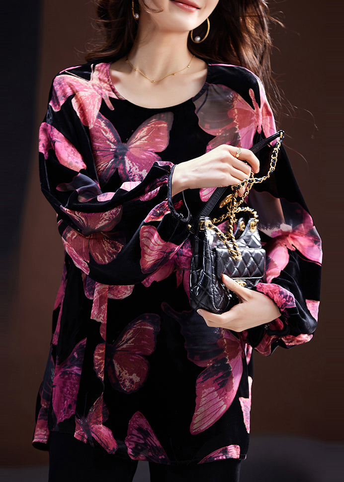 Unique Pink O Neck Print Velour Top Long Sleeve AC1008
