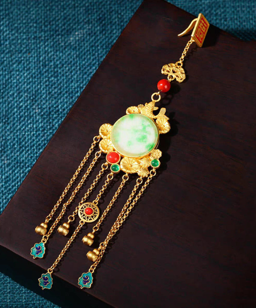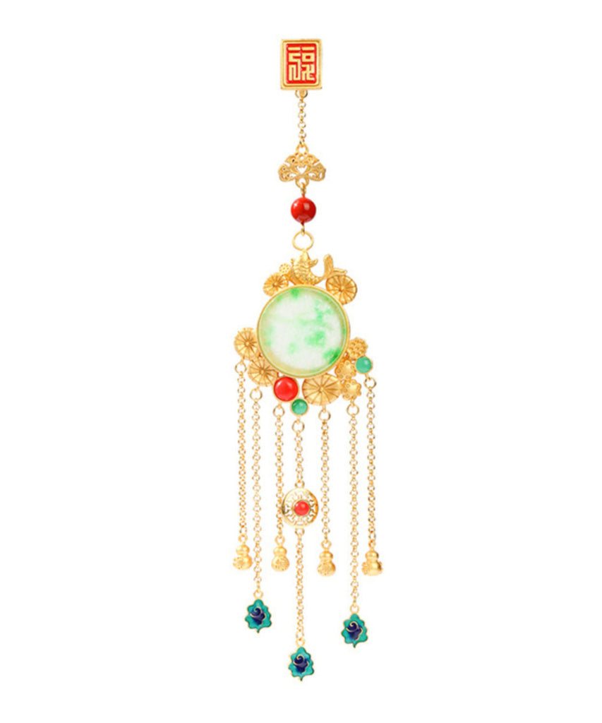 Lavishly crafted with impeccable artistry, this exquisite, ancient-inspired Stylish Gold Auspicious Clouds Enamel Agate Tassel Brooches add a touch of elegance and luxury to any ensemble.