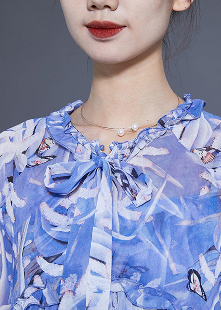 Boho Blue Ruffled Print Exra Large Hem Silk Beach Dresses Lantern Sleeve