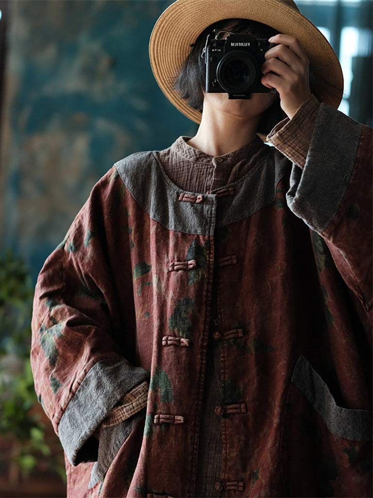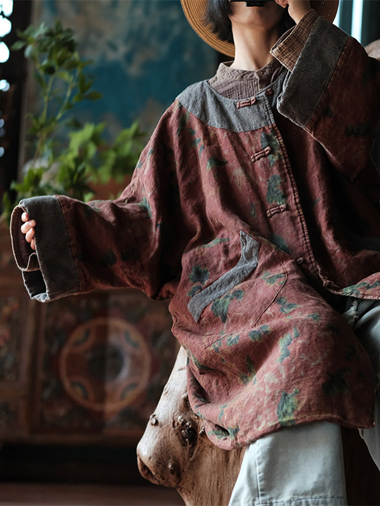 Women Autumn Ethnic Flower Colorblock Linen Robe Coat AI1060