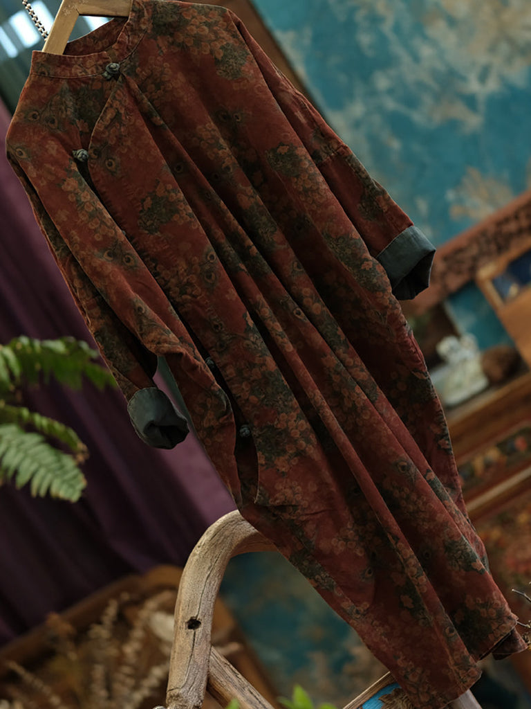 Women Autumn Vintage Flower Cotton Robe Dress AT1081