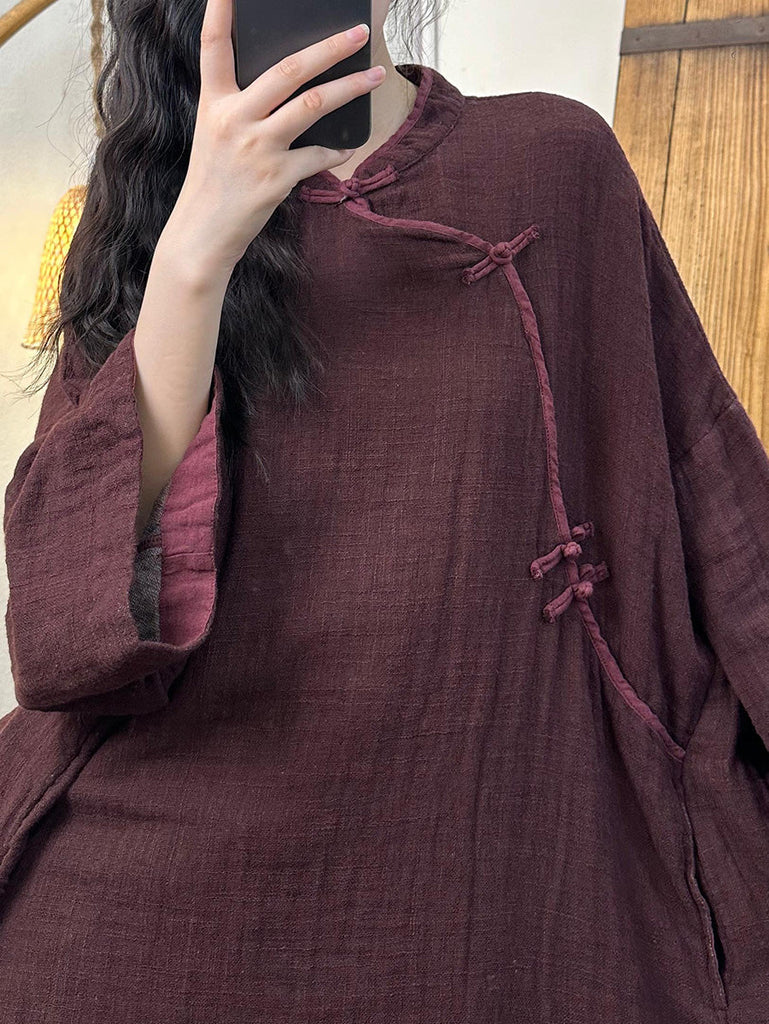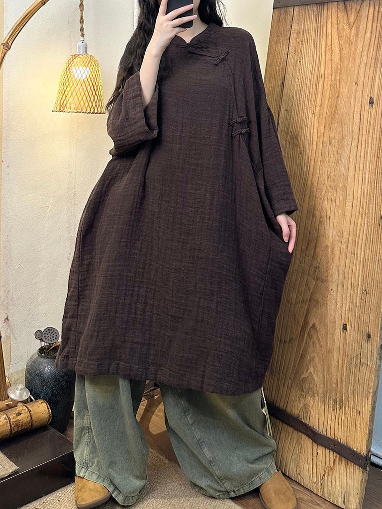 Women Vintage Autumn Solid Linen Cotton Robe Dress AH1016