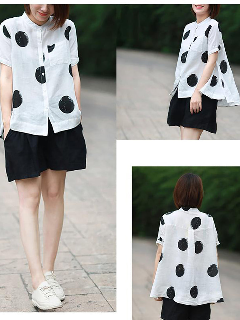 Dot Collar Stand Linen Polka Plus Cotton Size Shirt
