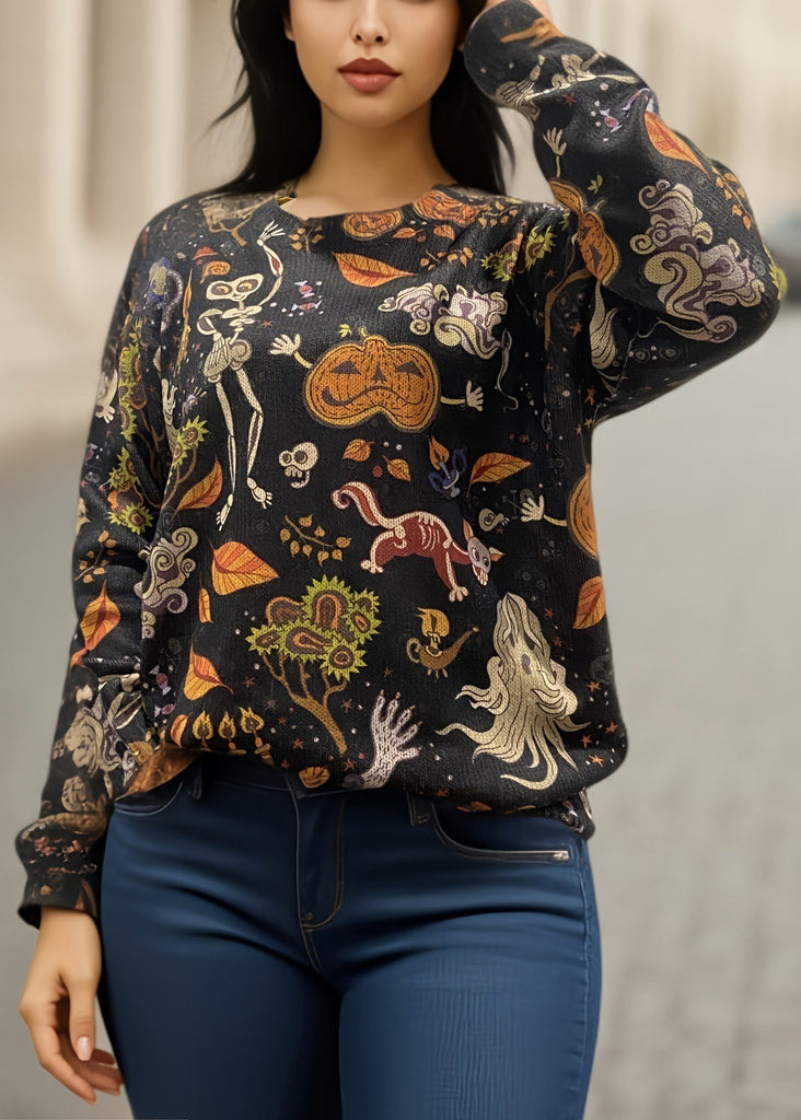 Plus Size Black O-Neck Print Knitting Cotton Sweaters Fall AE1017