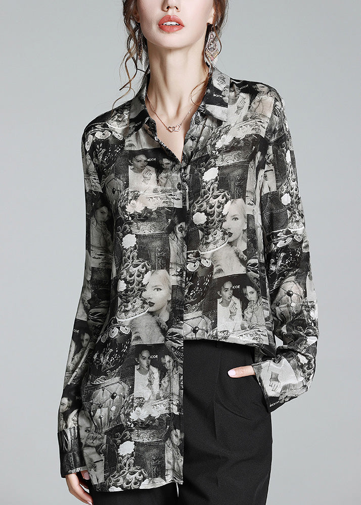 Life is too short to live without the Plus Size Black Peter Pan Collar Print Button Silk Shirt Long Sleeve AC3034. Be happy. Be Content. Be Satisfied.