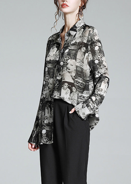 Plus Size Black Peter Pan Collar Print Button Silk blended Shirt Long Sleeve