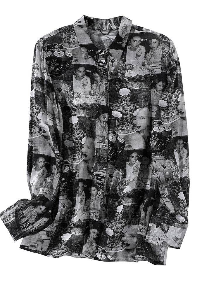 Plus Size Black Peter Pan Collar Print Button Silk Shirt Long Sleeve AC3034