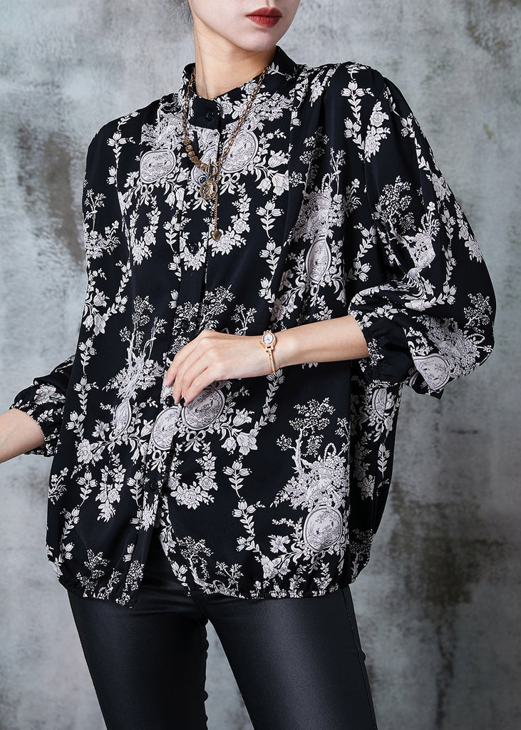 Plus Size Black Stand Collar Print Chiffon Shirts Summer