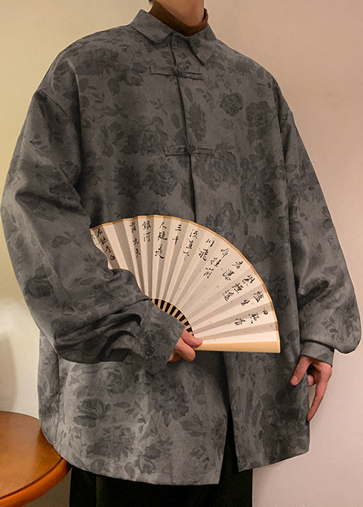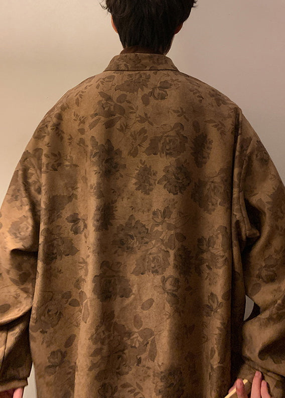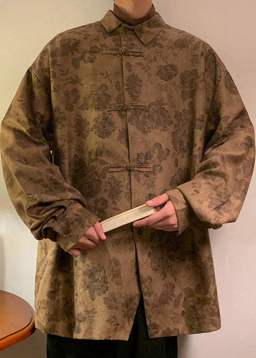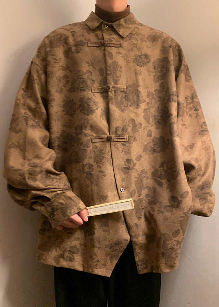 Plus Size Khaki Button Print Cotton Men Shirts Fall RO036